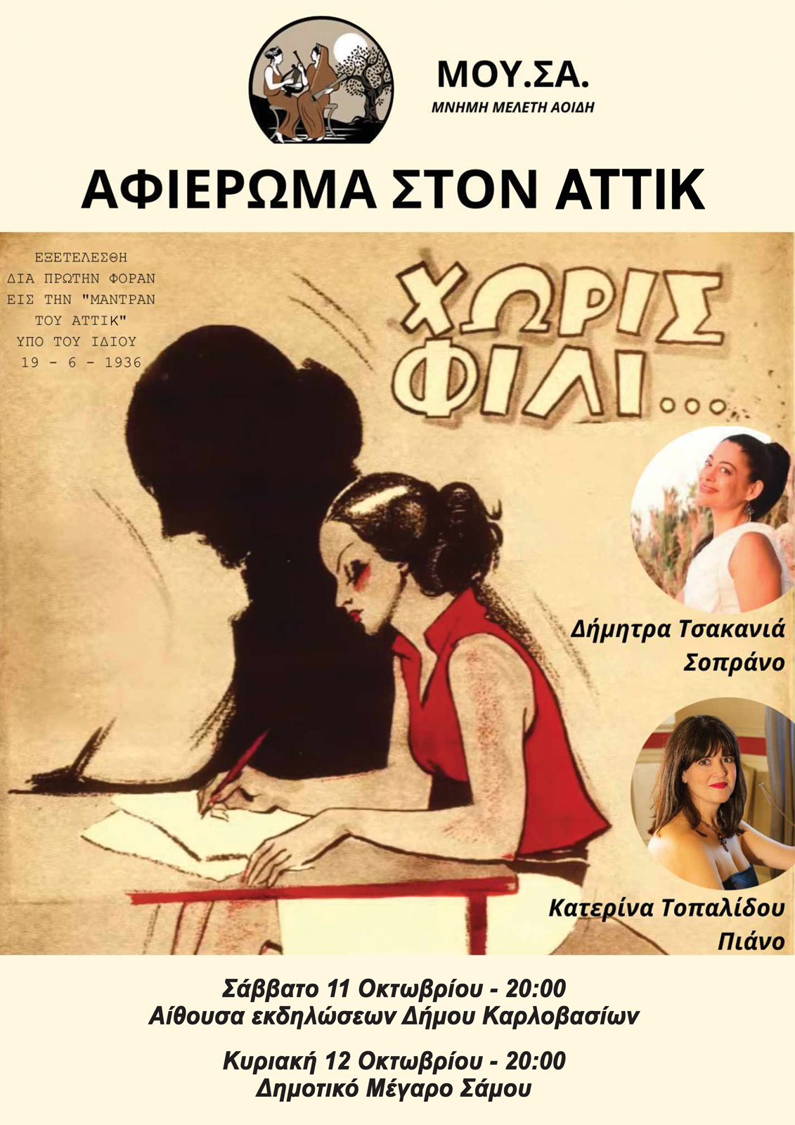 Ο Πολιτιστικός και Επιμορφωτικός Σύλλογος Σάμου «Η Μούσα των Σαμίων» σας προσκαλεί στην πρώτη του εκδήλωση της νέας καλλιτεχνικής περιόδου, σε ένα ξεχωριστό μουσικό αφιέρωμα στον Αττίκ, με αφορμή τη συμπλήρωση 140 χρόνων από τη γέννησή του.