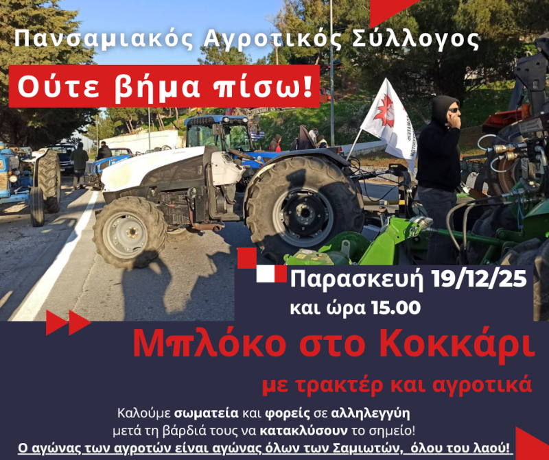 Την Παρασκευή 19 Δεκεμβρίου 2025, στις 15:00 το μεσημέρι, οι αγρότες του νησιού στήνουν μπλόκο στο Κοκκάρι, με τρακτέρ και αγροτικά, διεκδικώντας το αυτονόητο: να μπορούν να μείνουν στη γη τους, να καλλιεργούν και να ζουν με αξιοπρέπεια.